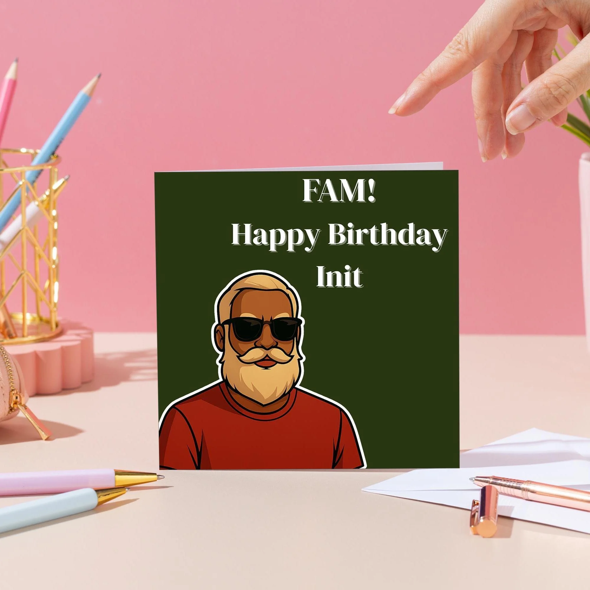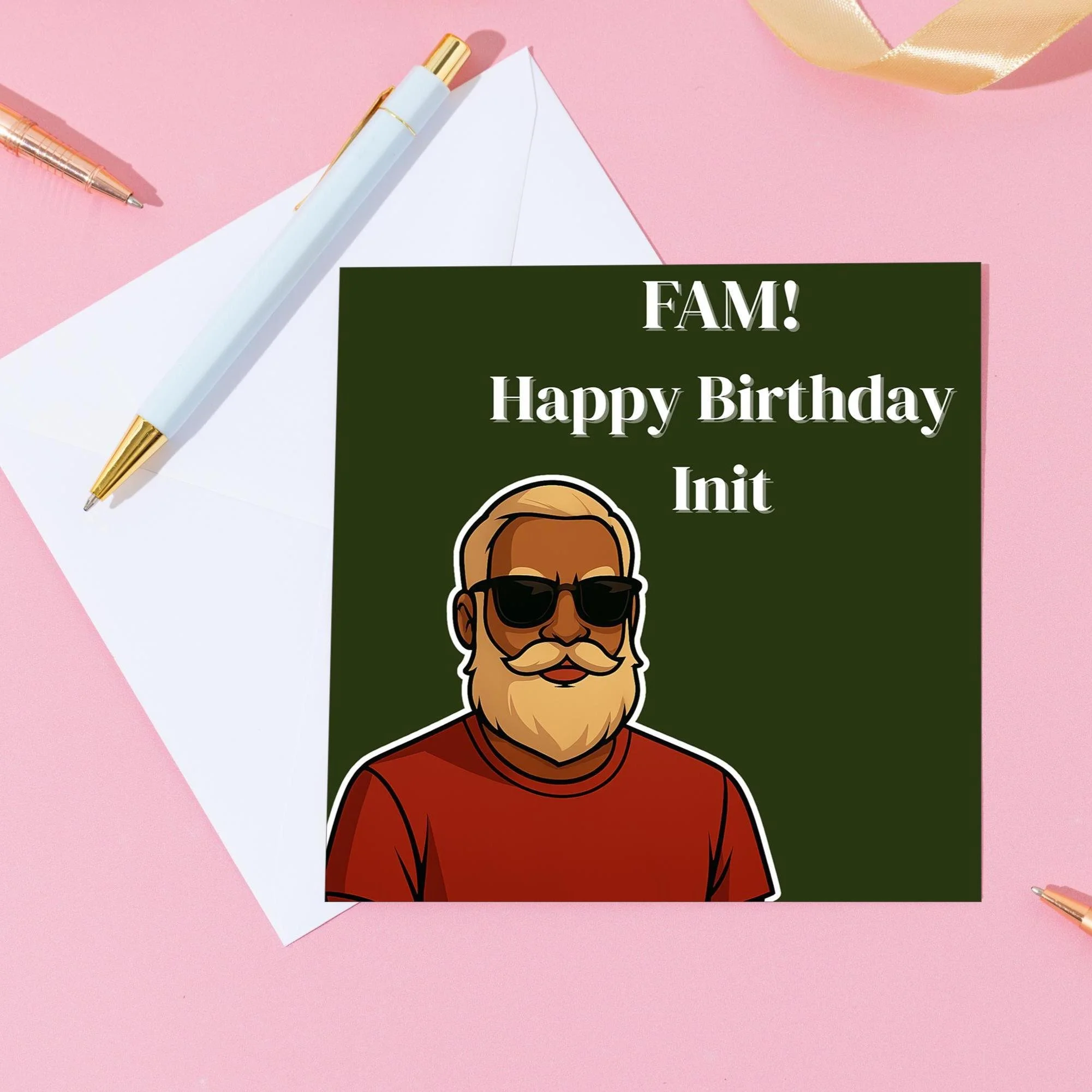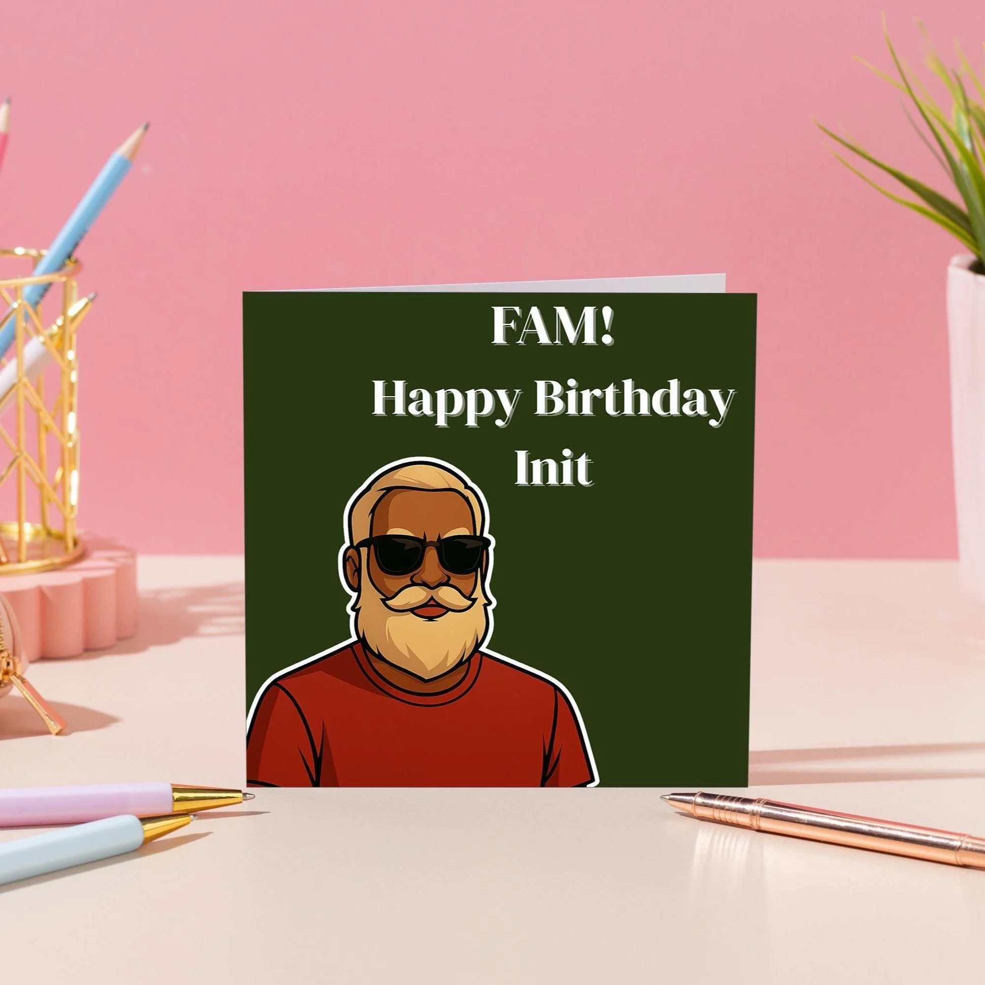 This bold, funny birthday card features a cool illustrated character with the phrase “Fam! Happy Birthday Init” — perfect for anyone who appreciates a bit of humour, personality, and UK slang.