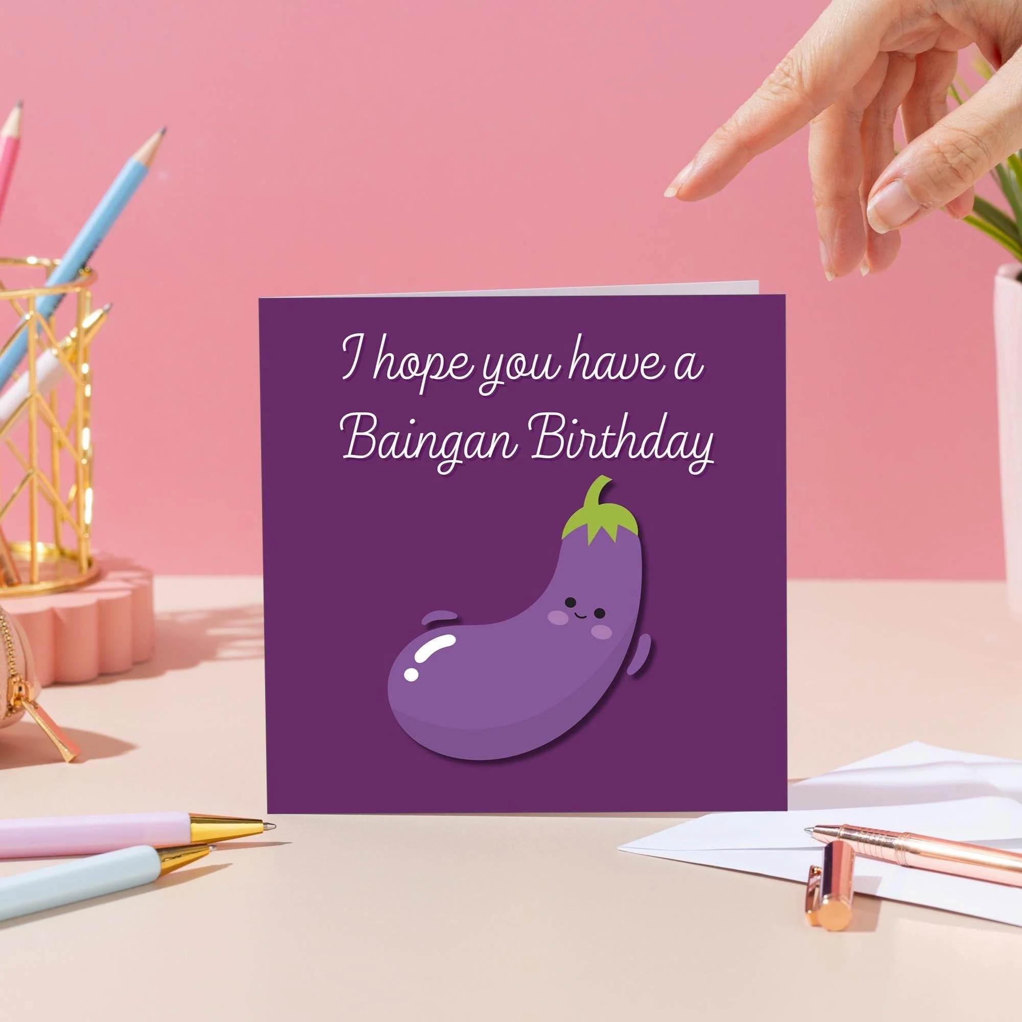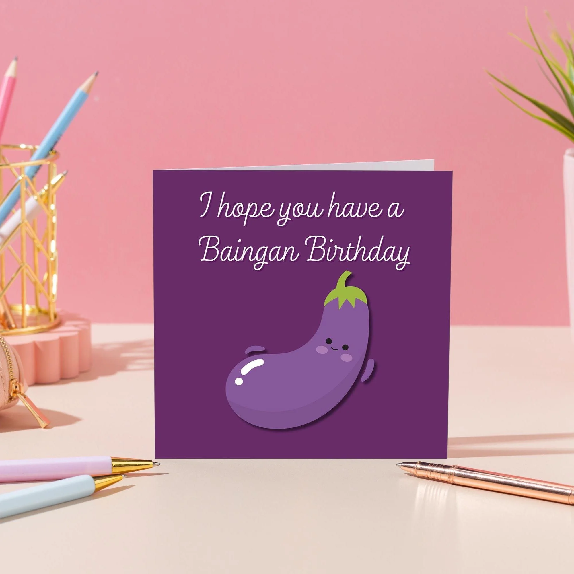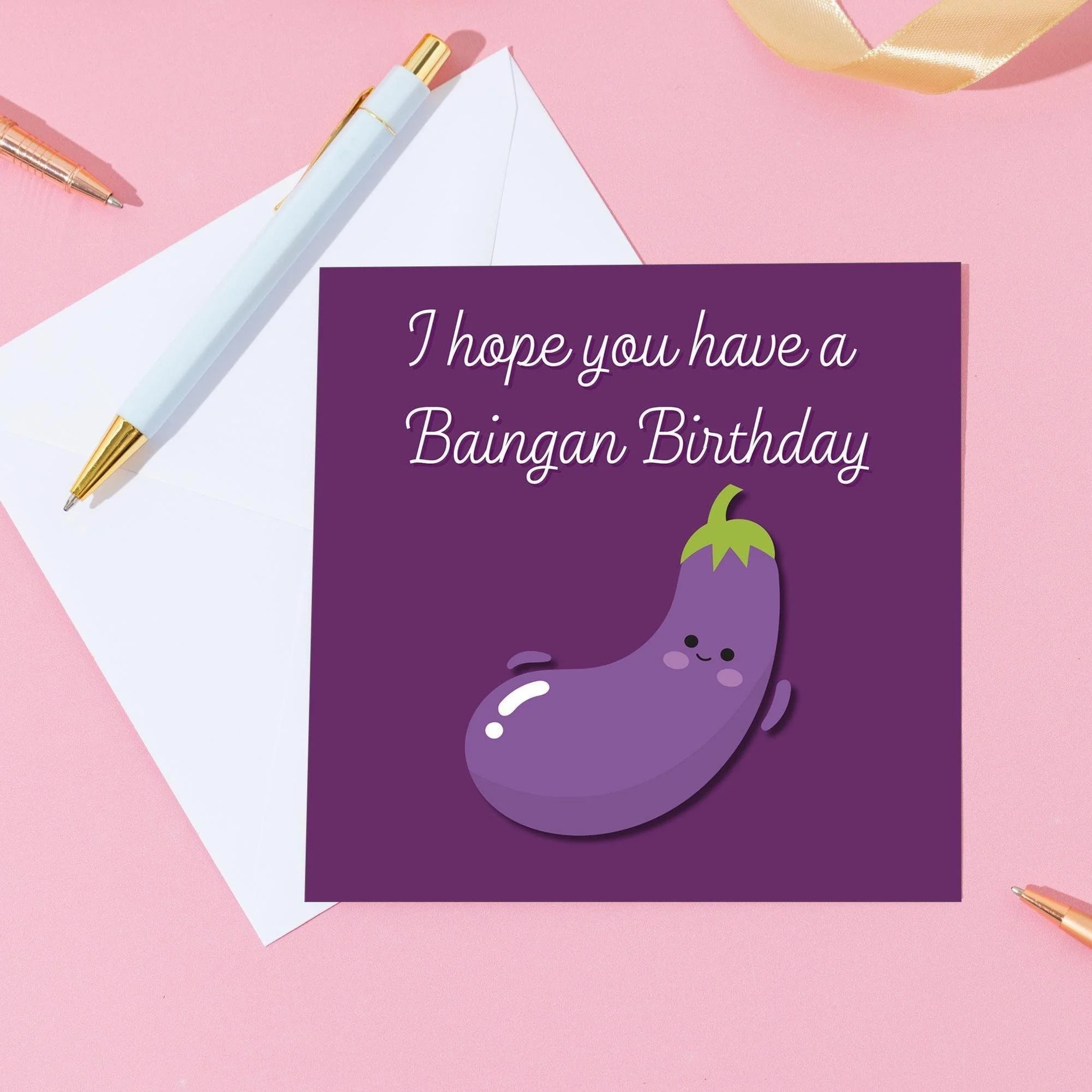 This funny pun birthday card features a cute aubergine illustration with the phrase “I hope you have a Baingan Birthday”—perfect for anyone who loves a good (and slightly ridiculous) food pun.